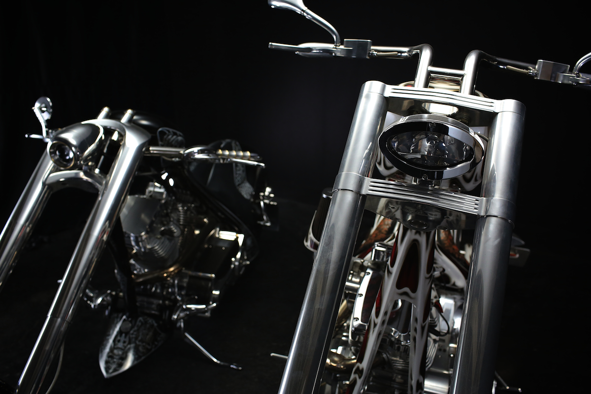 たまたま、現在、ドイツ・THOMAS HABERMANN (トーマス・ハバーマン) の手によりますリアル・ジャーマン仕様のモンスターが2台、弊社に揃っておりましたので、そんなスーパー・ゴージャスな2-ショットを撮影させて戴きました。しかし、その眺め… なんとも壮観でありまして、いつぞや、ドイツで観た本場のカスタムショーさながらでありまして、1人ニヤニヤしながらシャッターを押し続けた次第です。海外向け様の弊社ももう一つのブログ : BL-GRAPH に、もっと多くの写真をアップ致しておりますので、是非以下リンクよりご覧になって下さい。また、ご覧戴いておりまし e-Boss : Dragon (白い方のカスタム) は只今、委託販売の為、弊社にてお預かり中ですので、そちらの詳細のご案内も是非ご覧になって下さい!!
