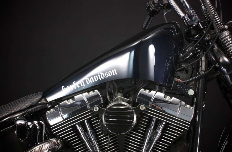 製作を進めておりました TwinCam Springer Softail ベースのカスタムが完成!! 命名を SL GUN と決めさせて頂いた所で、たっぷりと時間を掛けまして撮影を行いました。写真で濃いブルーにも見えるガソリンタンクやフェンダーですが、下にはシルバーのフレアーがゴースト風にペイントされており、その上からキャンディー・ブラックにてフニッシュを致しております。