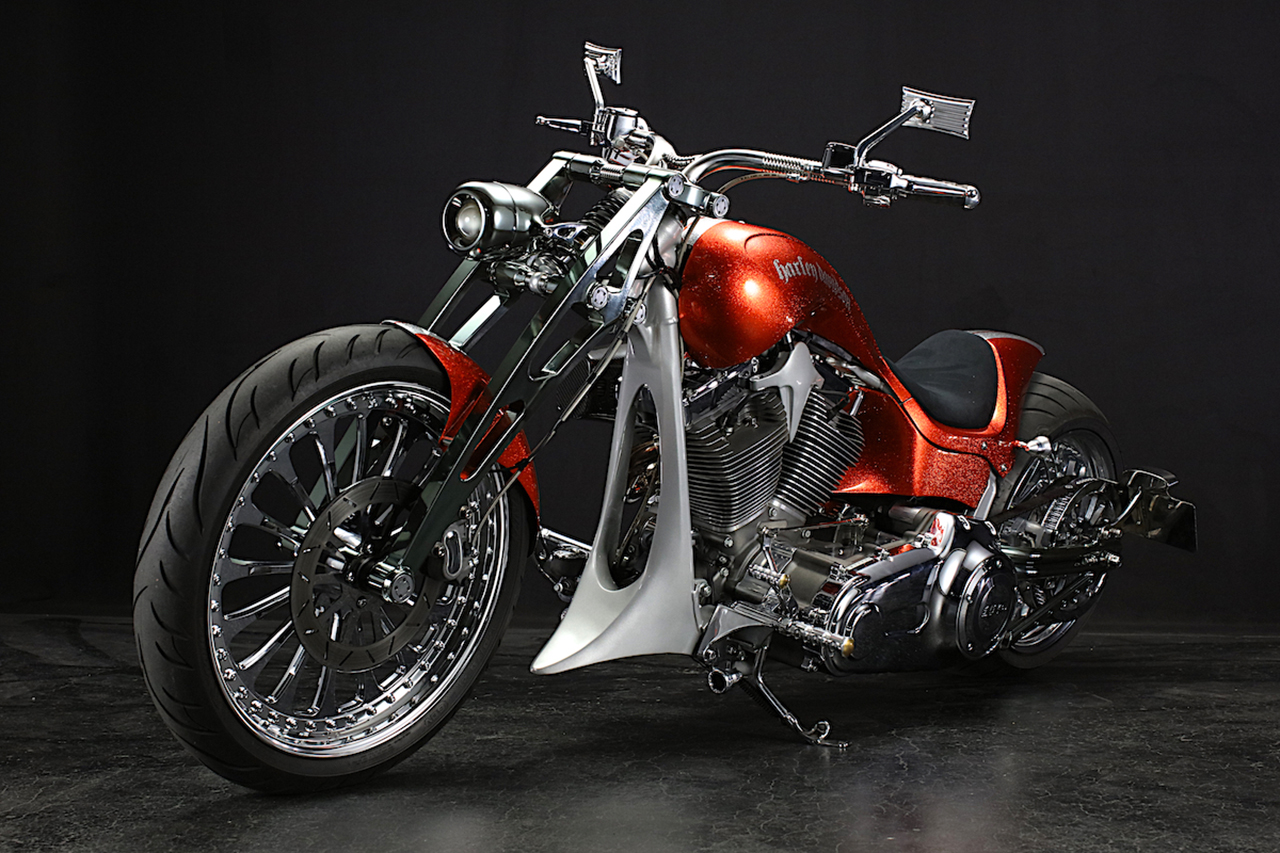 弊社オリジナルのホィール : OUT RAGEを使用。印象的なデザインのガーターフォークをはじめ、ハンドル / ガソリンタンク / オイルタンク / 前後フェンダー / エキゾースト・システム / ワイド・スィングアーム / その他、各種ブラケット等々、全てのパーツを弊社にてワンオフにて製作をさせて頂き、まさにスーパーハイエンドの名に相応しい仕上がりとなったカスタムです。