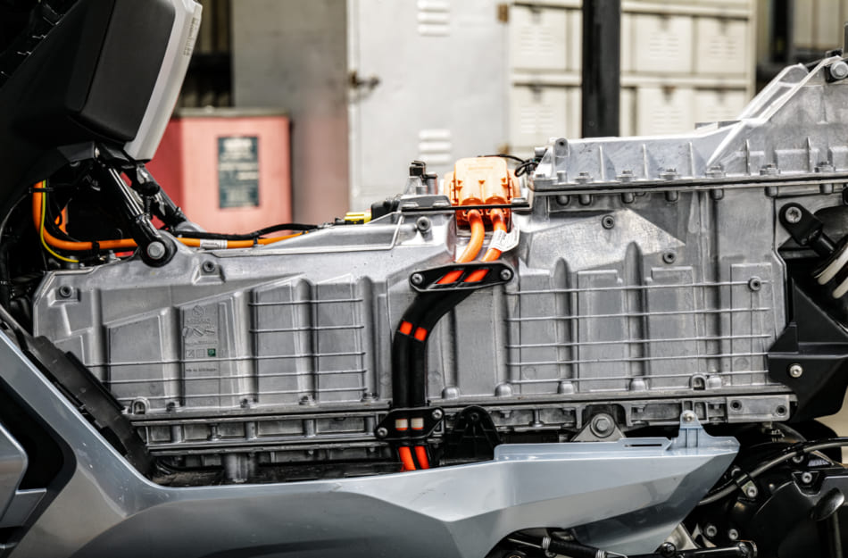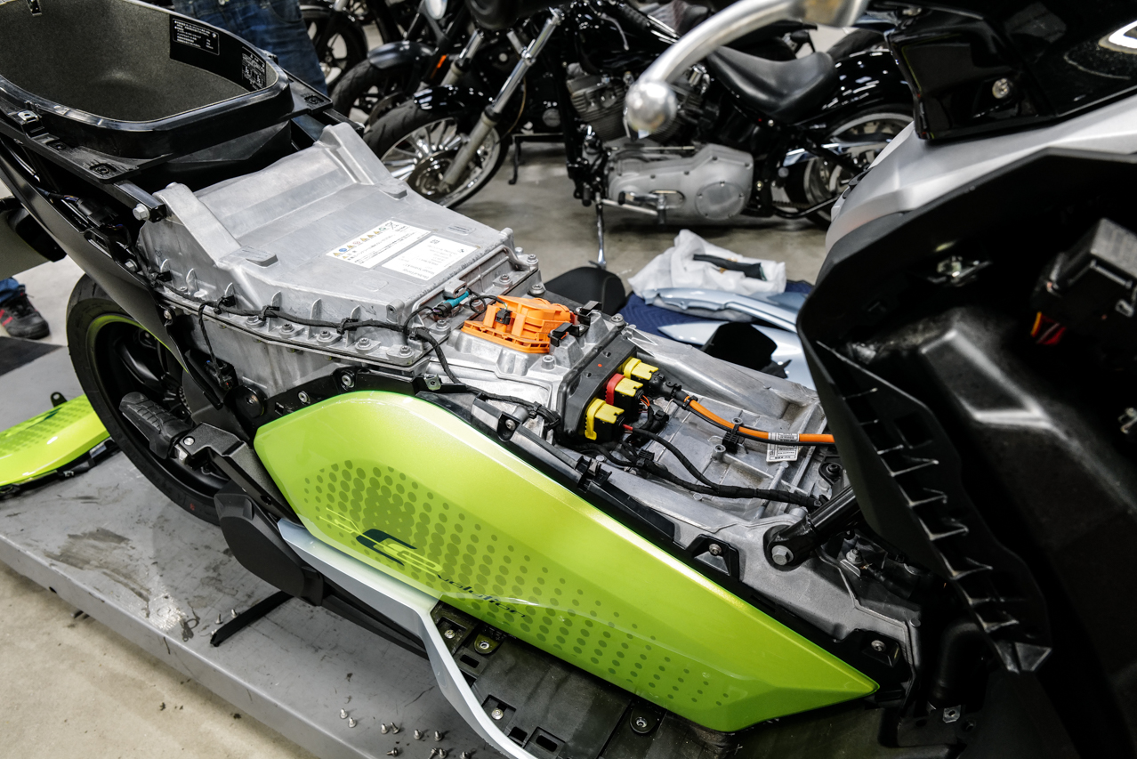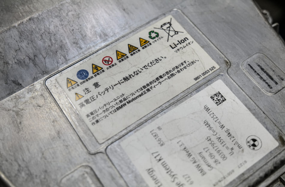 外装のボディーパーツをバラしてみますると… オートバイでは見た事も無い、何やら巨大な鉛色の箱がそこに鎮座しているではありませんか!! しかもですよ、ボディーのほぼ全てがその鉛色の箱だけでしか無く。。。高電圧を発生させる巨大リチウムイオンバッテリーの存在感は凄まじく、メチャクチャCOOLな佇まいと造形美に、それはそれで充分に心惹かれる部分もあるのですが、何せ『感電するからな!』とのアンタッチャブルなステッカーが貼られている以上、我々はもうそこから前に進む事は出来ませんでした。